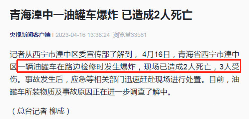 4月16日,青海省西寧市湟中區一輛油罐車在路邊檢修時發生爆炸,現場已造成2人死亡,3人受傷。