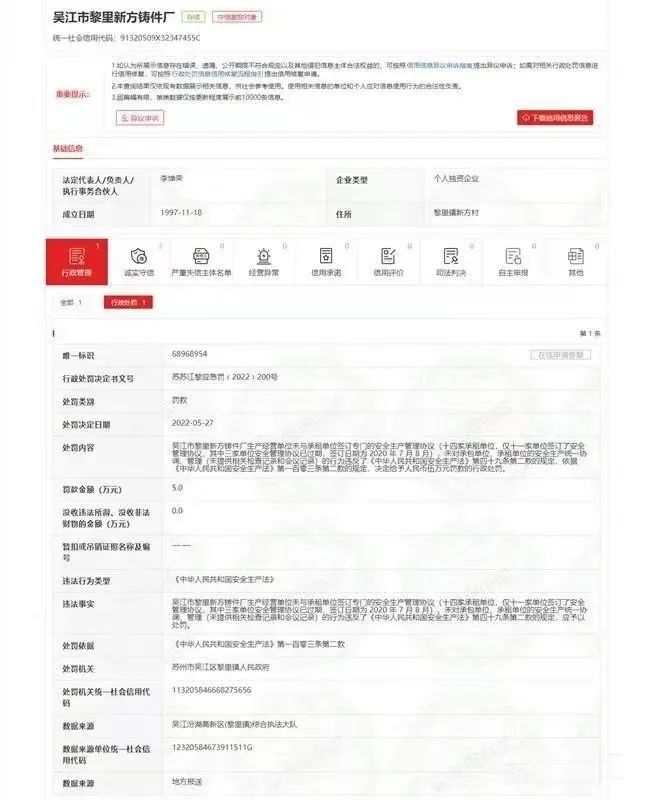 公開資料顯示,吳江市黎里新方鑄件廠成立于1997年11月18日,注冊資本51.8萬元人民幣,投資人李坤榮,統(tǒng)一社會(huì)信用代碼91320509X32347455C,注冊地址為黎里鎮(zhèn)新方村。